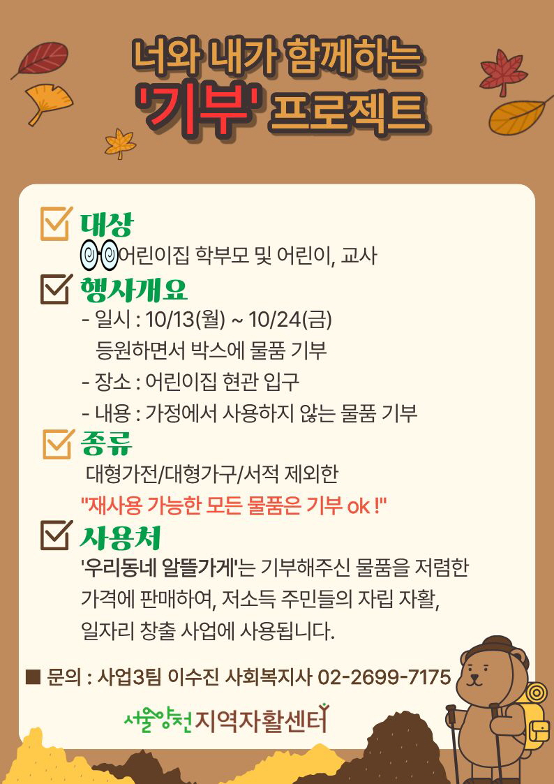 [재활용사업단] 어린이집과 함께하는 기부 프로젝트 페이지 정보 작성자 관리자 조회Hit 41회 작성일Date 25-11-11 17:10 본문 10월 13일 부터 10월 24일까지 어린이집에서 재사용 가능한 물품을 기증하는 기부 프로젝트가 진행되었습니다.가정에서 사용하지 않는 물품들을 직접 기부하면서,이웃을 돕고 환경도 살릴 수 있는 가치있는 활동이었습니다. 목록 이전글[재활용사업단] 다함께 행복나눔 바자회 홍보 및 수거 진행 25.11.12 다음글[초록우산] 이륜차 지원 25.11.11