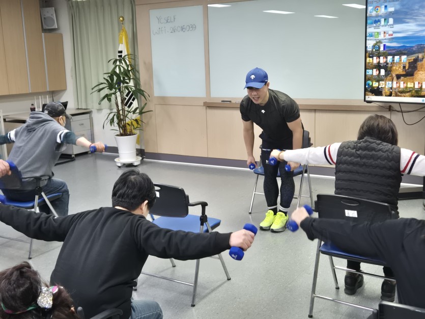 이번 수업은 스트레칭을 중심으로 의자를 활용한 근력 운동과 아령 운동까지,